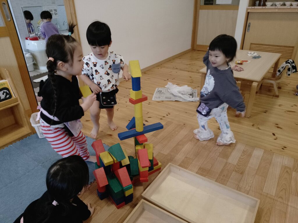 「ここにこうやって置いてみる?」「こうすればいいんじゃない?」とアイディアを出し合いながら作ると、立派なお家のできあがり!「できた~!!」と満足そうな子ども達です!