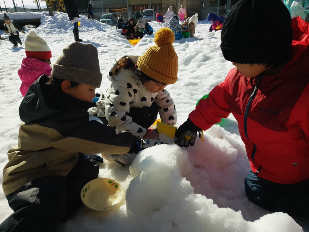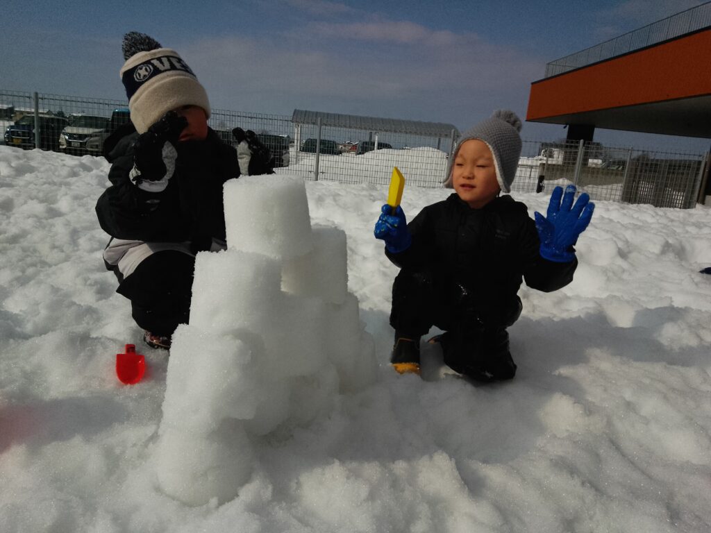 雪遊びの遊び方もどんどん発展し、お城を作ったり、レンガのお家に見立てて、「接着剤ペタペタ~」と塗ったり、想像を膨らませながら楽しんでいました!✨