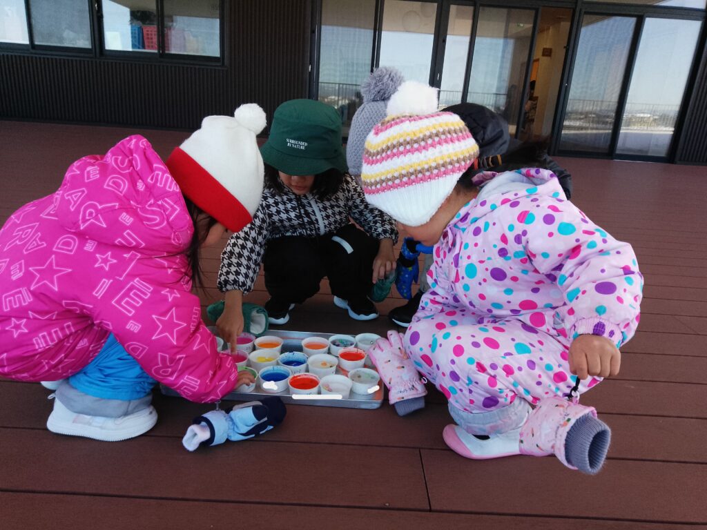 雪遊び前にはテラスに置いたカップを見に行き、「凍ってるかな~」「まだ凍ってなかったからまた後で見に行こう!」とワクワクでいっぱいな様子でした!