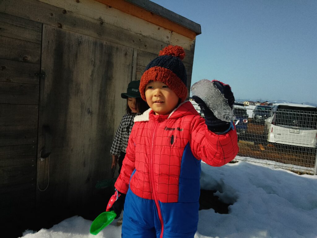 雪遊びを毎日楽しみにしている様子の子どもたち。つららや大きな氷を見つけると、「こんなにおっきなのがあったよ!」「ここにあった!」と教えに来てくれていました!