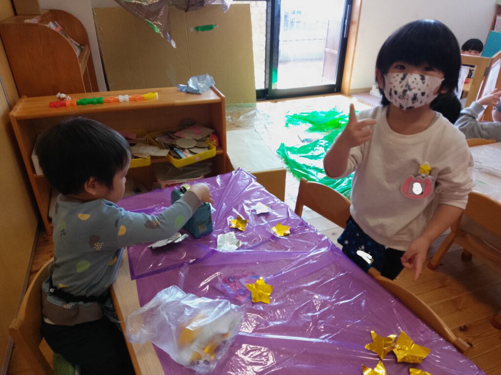 お星さまをハサミで切ったり、宇宙服を作ったり・・・子どもたちの発想力に驚かされる日々です!
