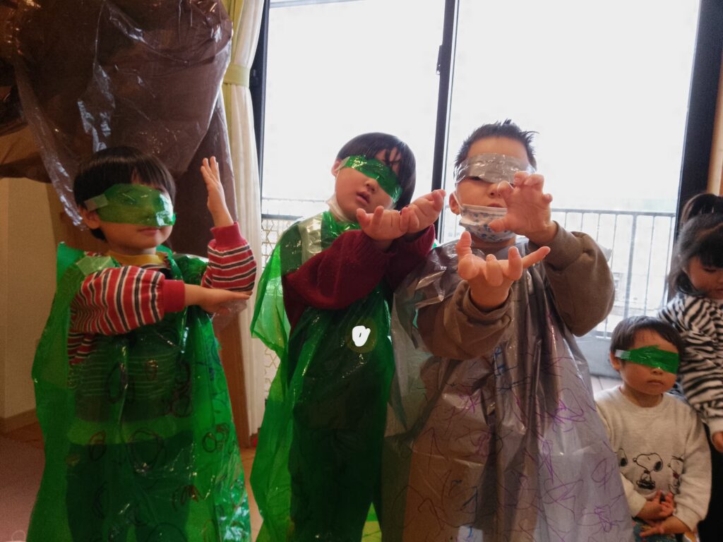 絵本から興味を持ち、子どもたちなりの表現の仕方で再現遊び、造形遊びを楽しんでいます!