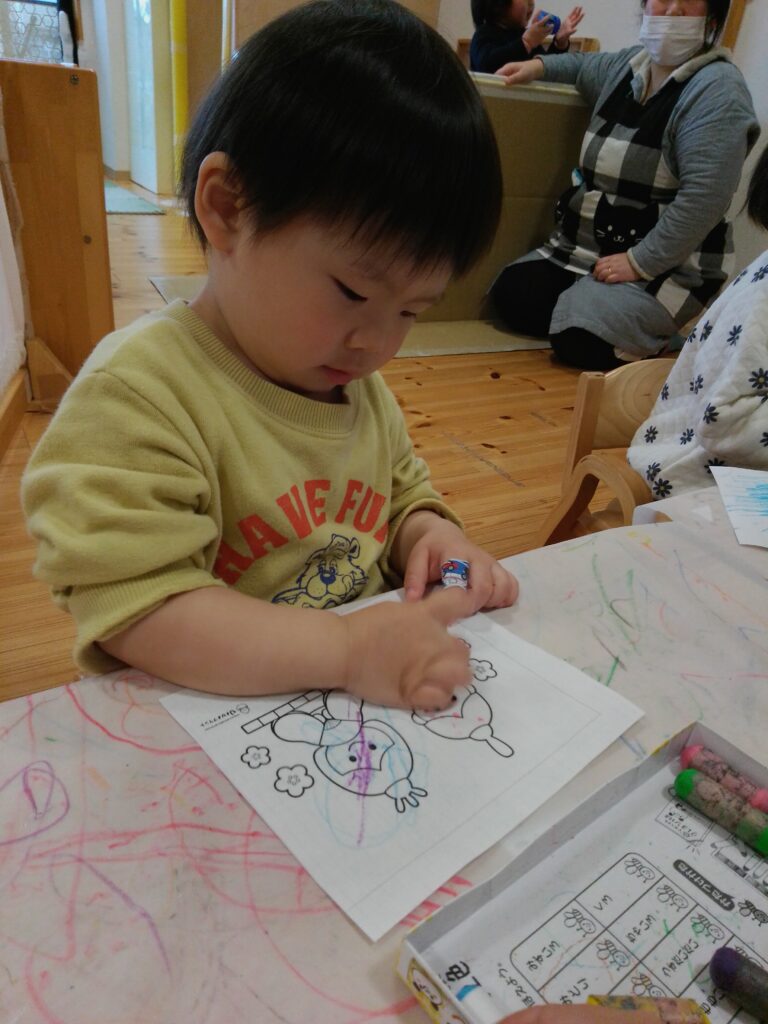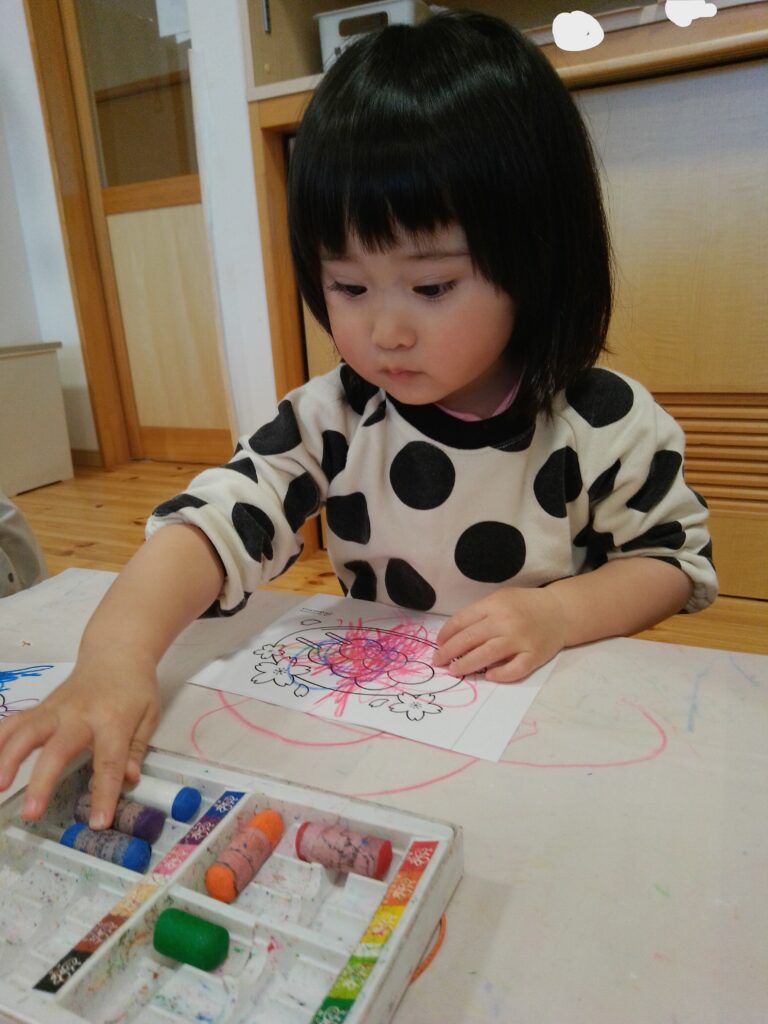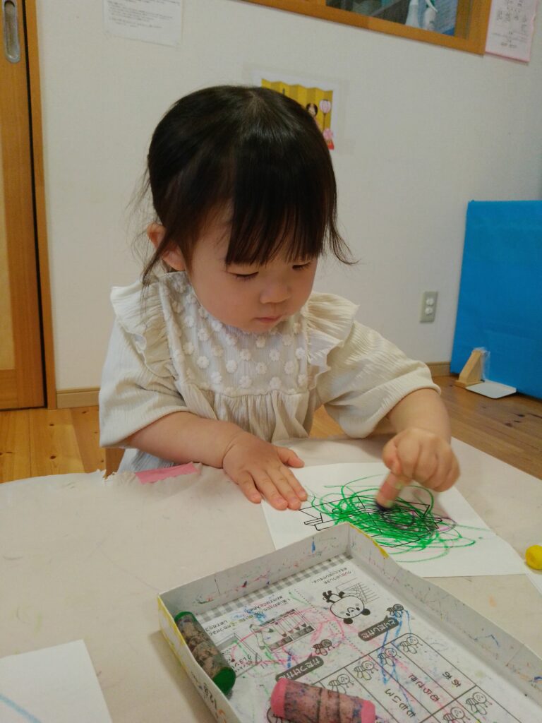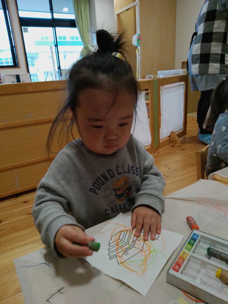 クレヨンを見た瞬間、「かきかきするの!?」と目を輝かせていました。「ぬりえする?」と聞くと「これはなに??」と見たことのない絵に不思議そうな表情をしていました。