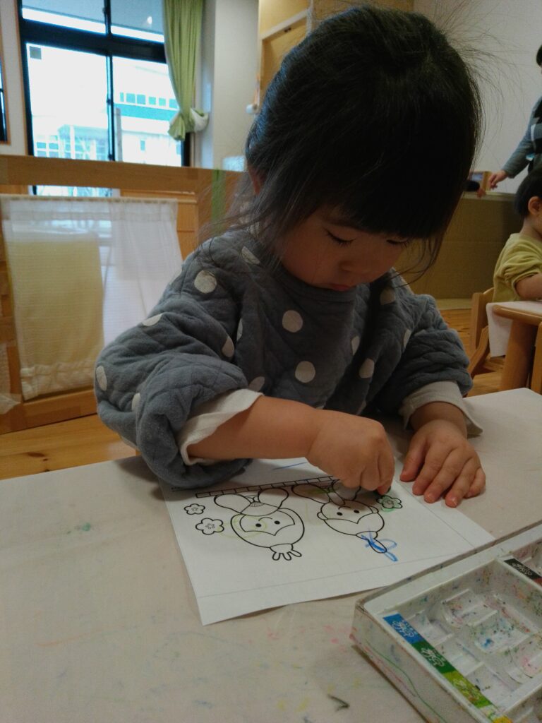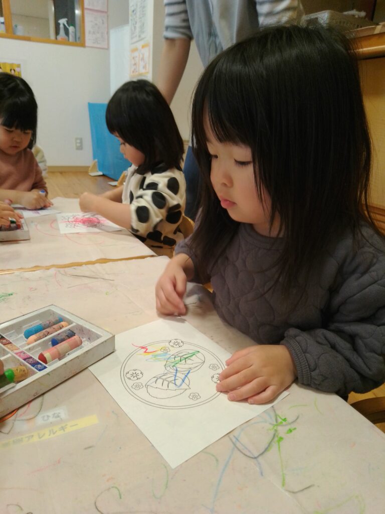 あひる組は普段から子どもたちが大好きなぬりえで、ひなまつりの行事を味わいました。