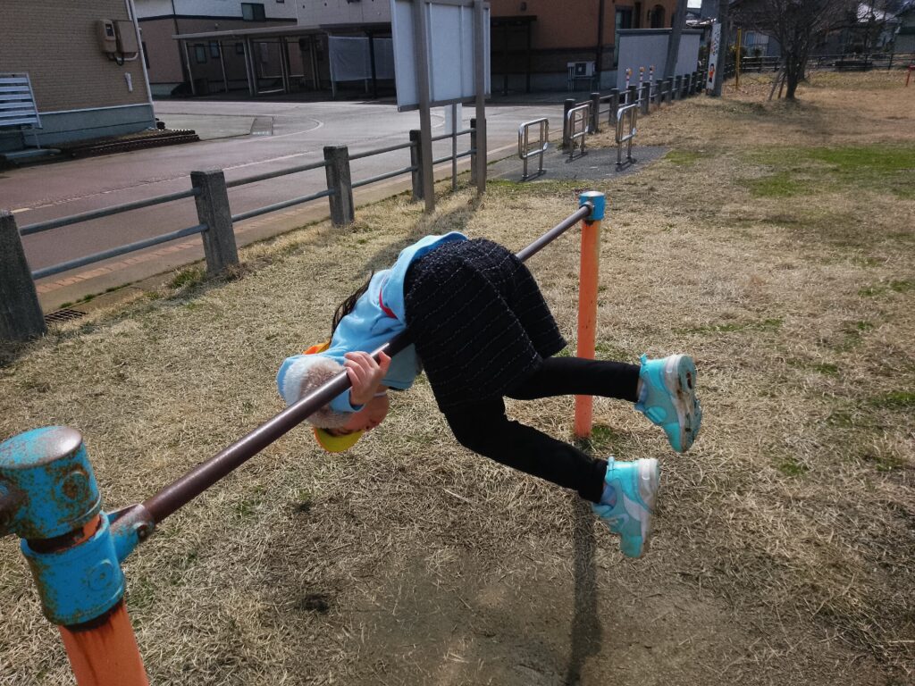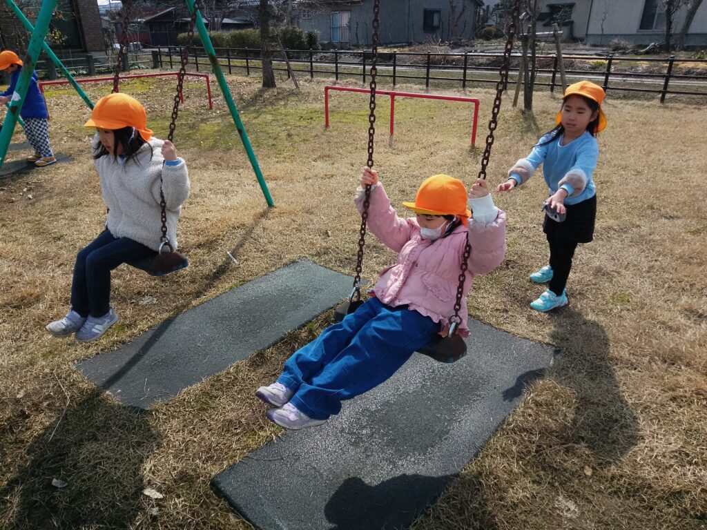 体力もついてきて、少し距離のある公園に行った時も疲れを見せずに元気いっぱい遊ぶ子どもたちの姿が見られます。ブランコも1人で漕げる子が増えてきて、どこまで高く漕げるか友達と一緒に挑戦したり、「先生見てて」と得意な鉄棒を披露してくれる子もいましたよ!