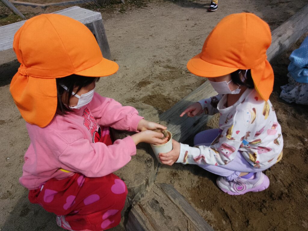 園庭では、友達と鬼ごっこをしたり砂遊びをしたりして楽しみました。