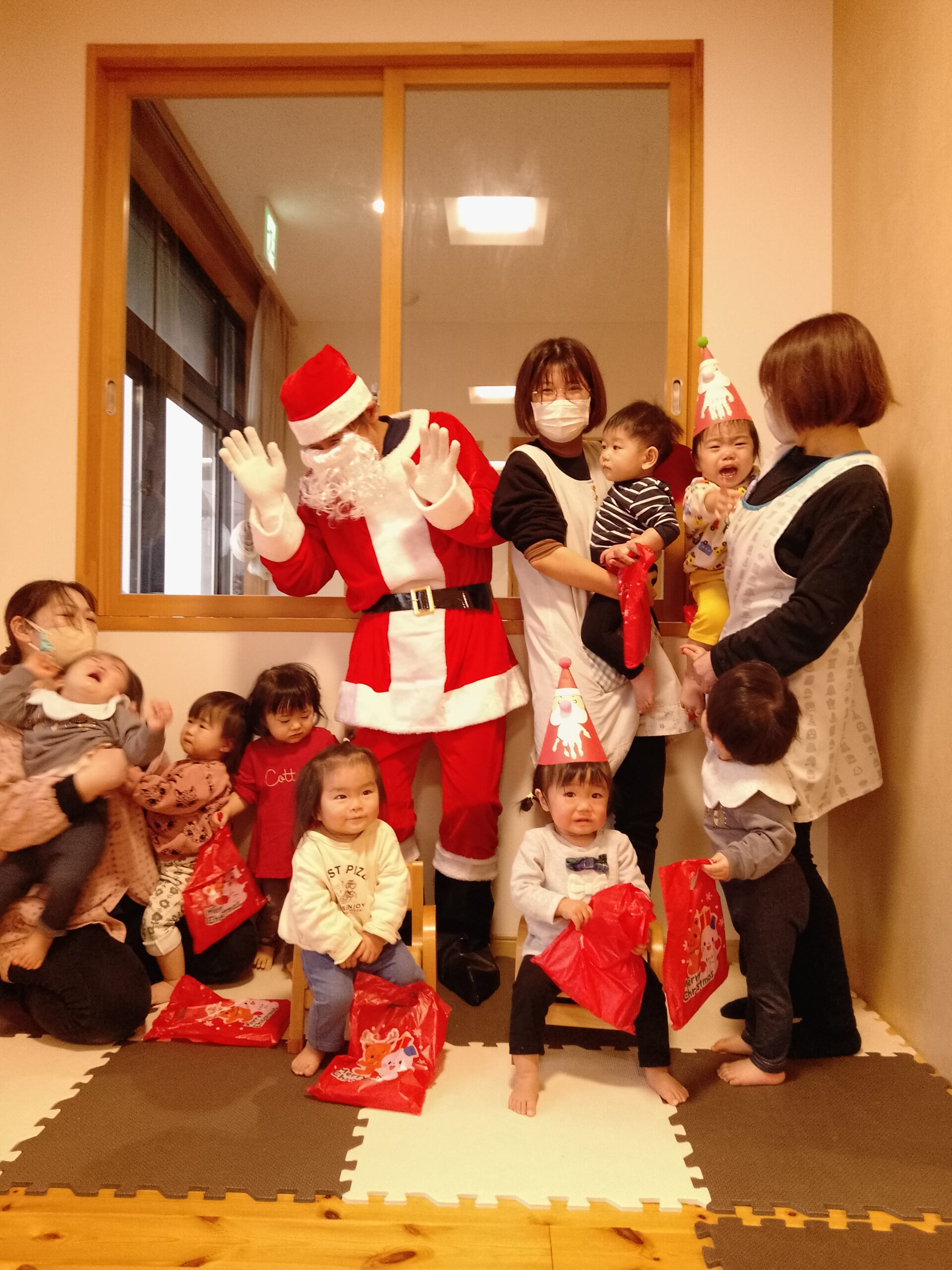 12月25日はクリスマス会がありました☆ お部屋にサンタさんが来てくれて一人ひとりにプレゼントを渡してくれました! サンタさんの登場に初めはビックリしたひよこ組さん!? プレゼント