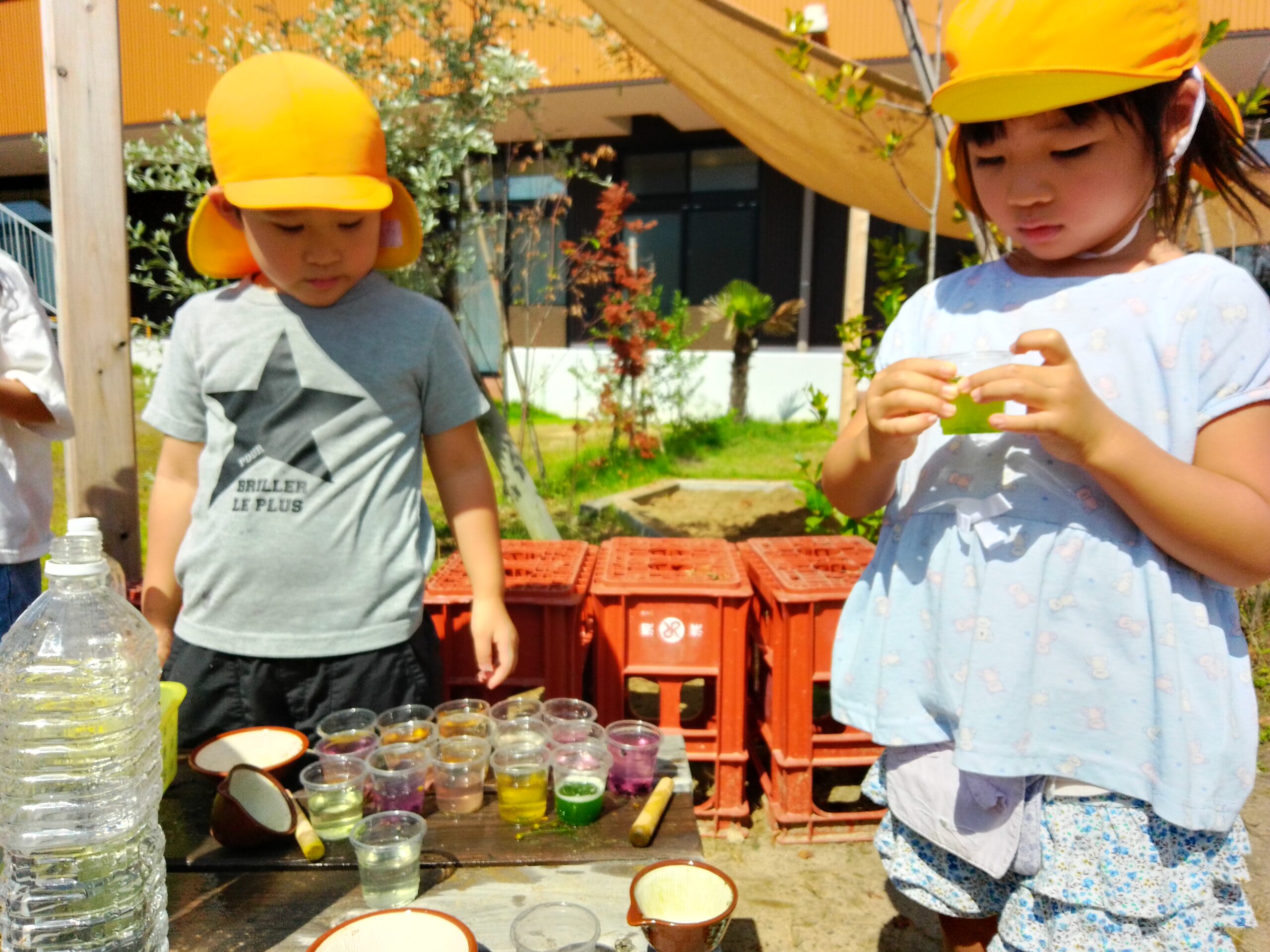 暑さが落ち着き、園庭に出て遊べるようになり、子どもたちは喜んで遊んでいます。 子どもたちが興味を持って遊んでいる遊びの1つが色水遊びです。夏は食紅で色水を作り、色を混ぜて遊ぶことを
